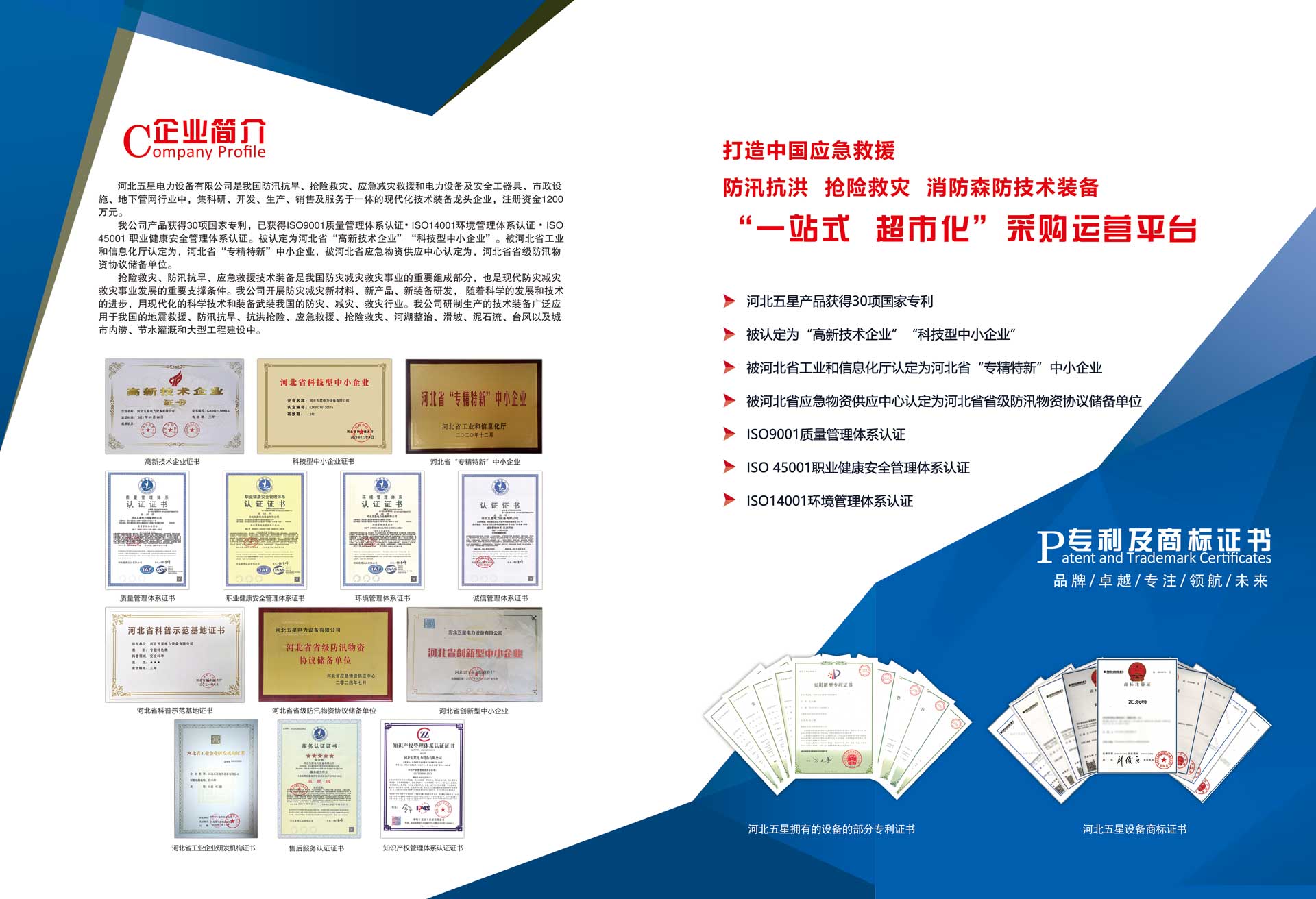 河北五星電力設(shè)備有限公司是我國防汛抗旱、搶險救災(zāi)、應(yīng)急減災(zāi)救援和電力設(shè)備及安全工器具、市政設(shè)施、地下管網(wǎng)行業(yè)中,集科研、開發(fā)、生產(chǎn)、銷售及服務(wù)于一體的現(xiàn)代化技術(shù)裝備高新技術(shù)企業(yè),注冊資金1200萬元?! ∥夜井a(chǎn)品已獲得ISO9001質(zhì)量管理體系...